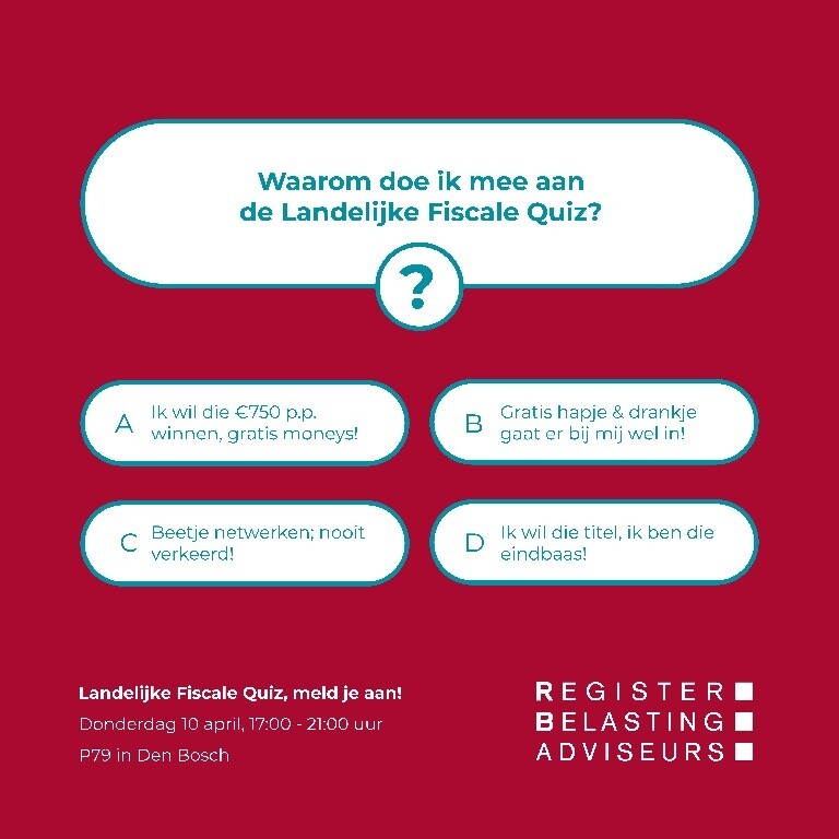 Ben jij een voltijd fiscaal student? Waag dan jouw kans in de gratis Landelijke Fiscale Quiz. Test je kennis en verdien, met een beetje geluk €750 euro p.p.! Of een andere mooie prijs. Voor iedereen geldt in elk geval: gratis hapjes, drankjes en veel gezelligheid.