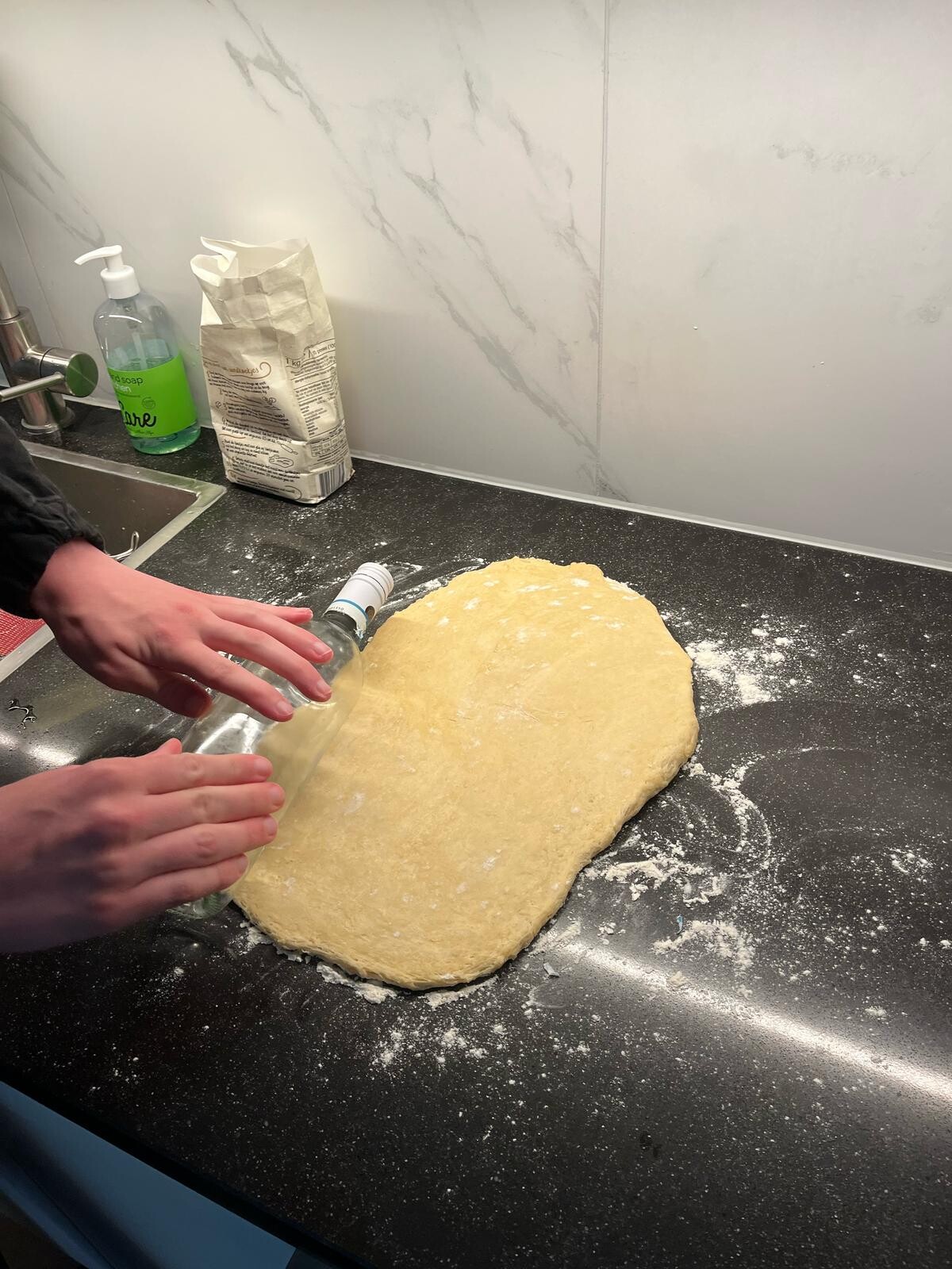 5. Deeg oprollen en snijden: Rol het deeg vanaf de korte zijde (30 cm) strak op tot een dikke rol. Snijd de uiteinden eraf en verdeel de rol in 8 gelijke plakken.